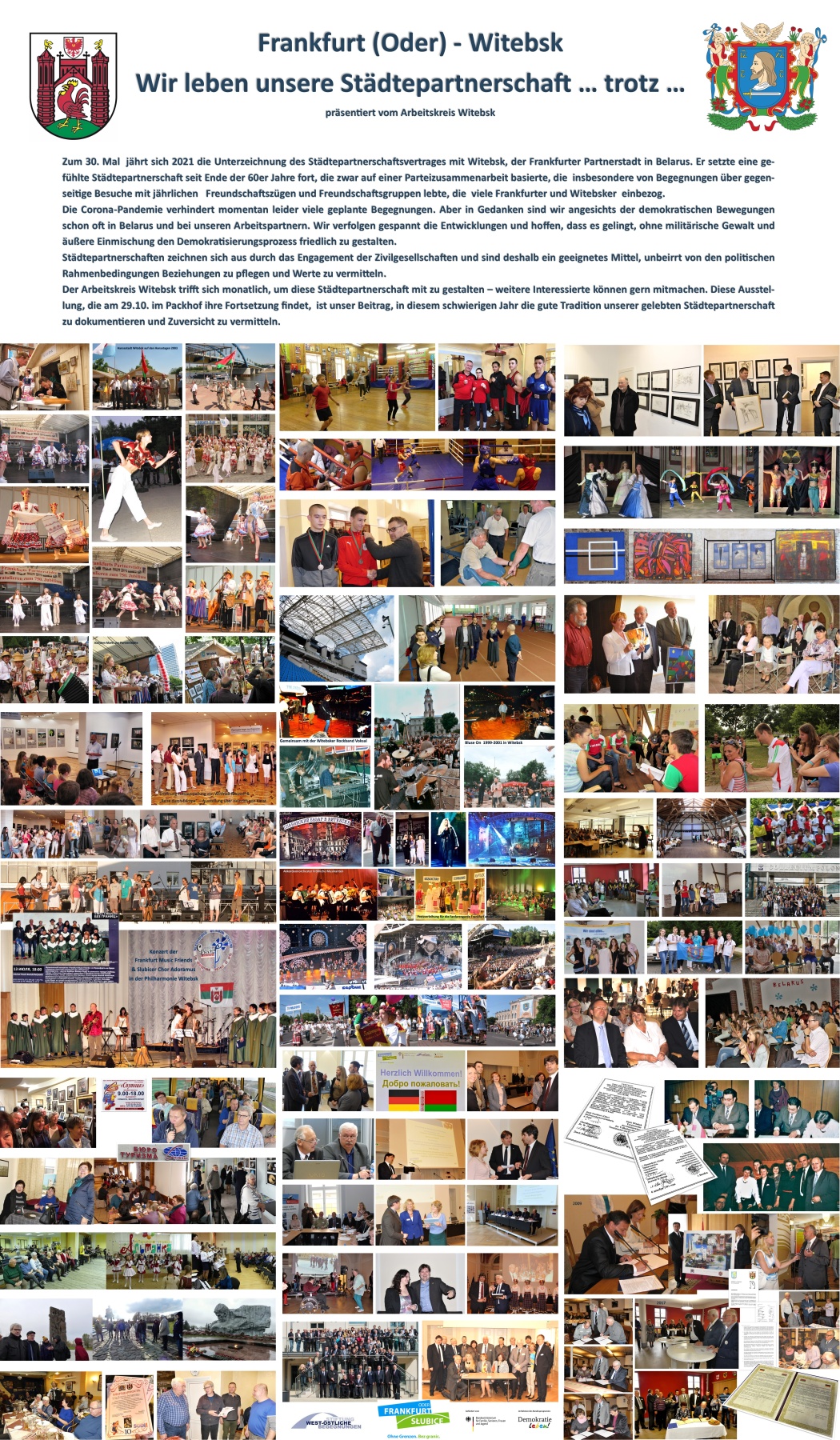 Im Arbeitskreis Witebsk engagieren sich Bürger für die Städtepartnerschaft zwischen Frankfurt (Oder) und Witebsk. Wir treffen uns ca. alle sechs Wochen, um aktuelle Aktivitäten abzustimmen und die Städte bei der Pflege der Städtepartnerschaft zu unterstützen. Wir sind offen für Jeden, der sich in unsere ehrenamtliche Arbeit einbringt und werben um noch stärkere Bürgerbeteiligung.