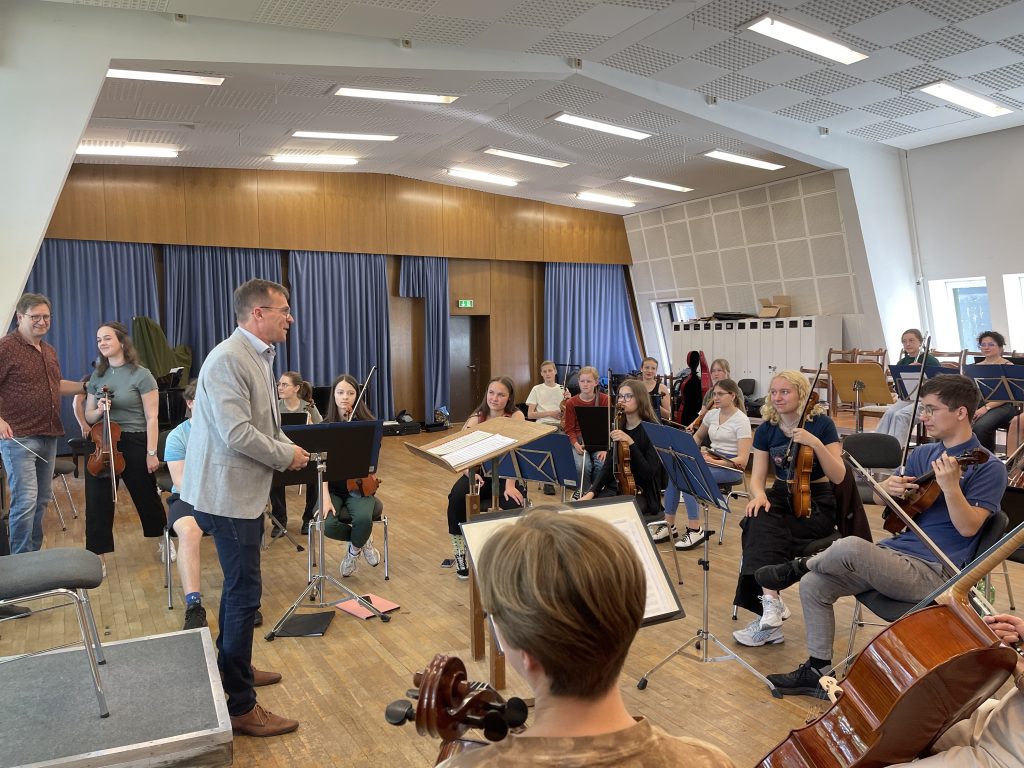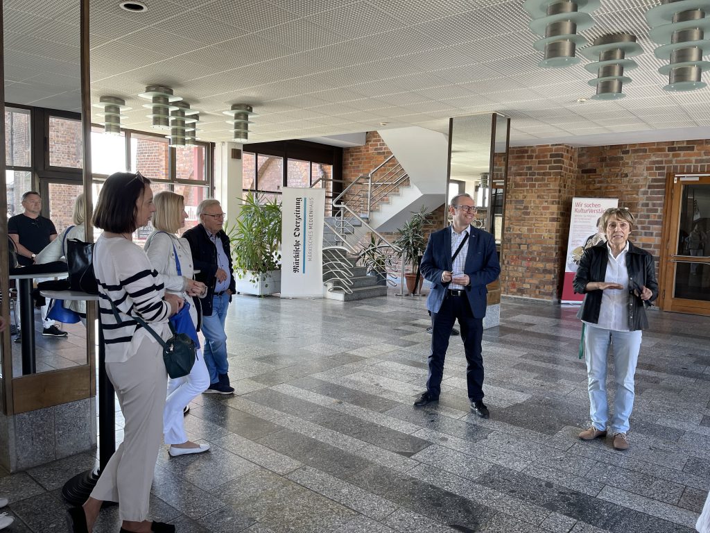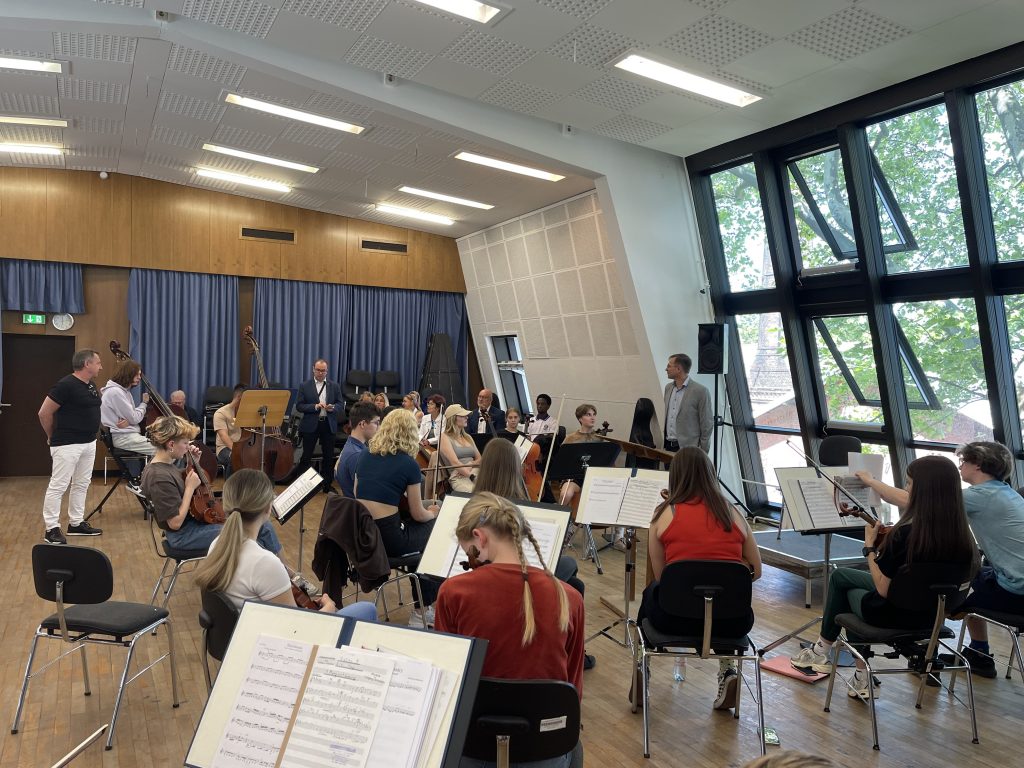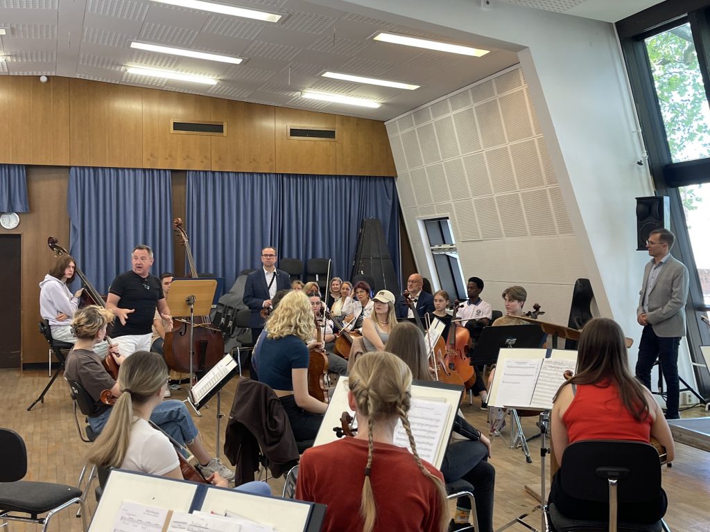 Ein sehr schöner Akzent unseres Aufenthaltes in der Konzerthalle war die Gelegenheit, an der Probe des polnisch-deutschen Jugendorchesters teilzunehmen, dessen Mitglieder Schüler von Zielona Góra und Frankfurt sind. In einem Workshop mit dem DPJO wurden die weiteren Pläne und Vorhaben im Vorfeld des 50. Jubiläums des Jugendorchesters vorgestellt und beim Vorspiel demonstriert. Nach dem Mittagessen, erneut in Slubice, ging es zurück zur Konzerthalle, wo wir eine Führung der besonderen Art erleben durften.